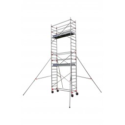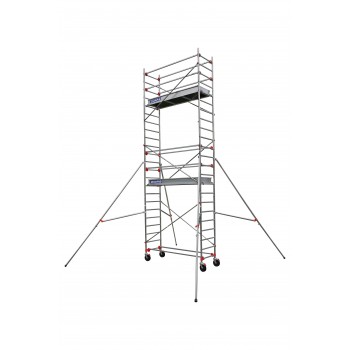 Le spécialiste de l'intérieur. Aluminium. Hauteur de travail jusqu'à 9.90 m. Longueur 2,05 m - Largeur 0,69 m. Conforme à la Réglementation Française / Décret 2004-924 - Norme NF EN 1004-1. Montage et démontage en sécurité par un opérateur. Base standard. Protection par lisses et sous-lisses. Passage des portes de 0,83 m. Dim. extérieures : Long : 2,15 m - Larg : 0,79 m. Plancher bac alu/bois, plinthes aluminium intégrées, une trappe, verrouillage sécurité. Surface utile 0,56 x 1,90 m. Charge maxi admissible sur un plancher : 209 kg. Stabilisateur unique pour toutes les hauteurs. Roues Ø 200 mm réglables sur 150 mm tous les 10 mm. Installation en dénivelés maxi de 1,00 m. Ø des montants : 45 mm.